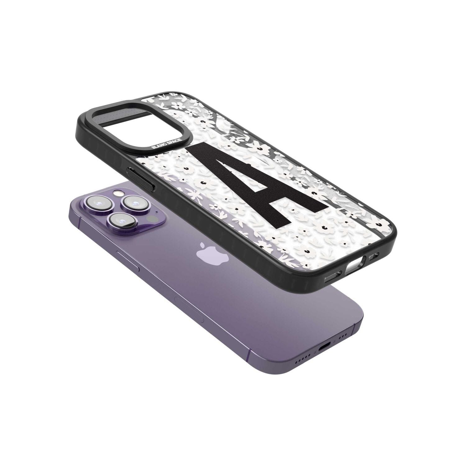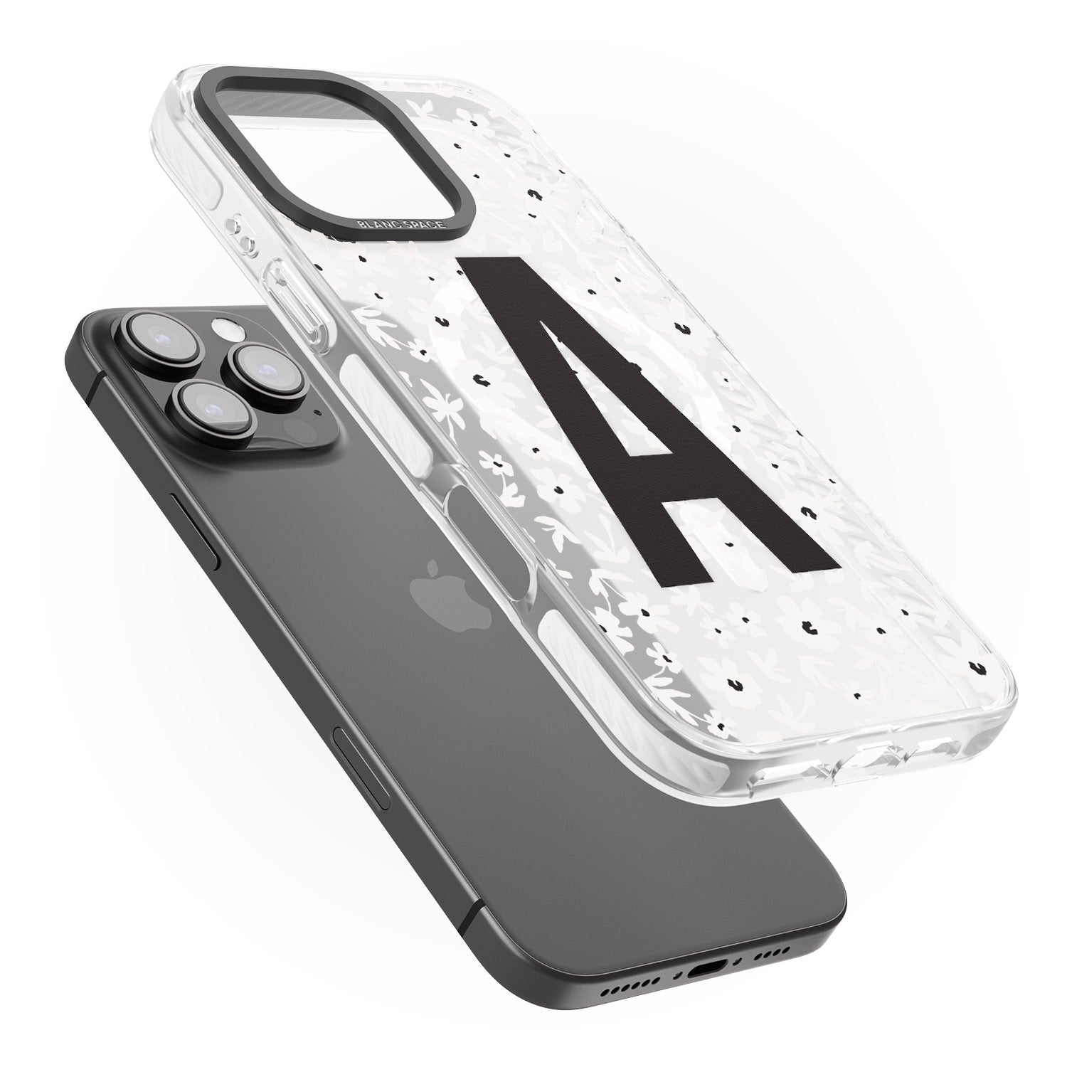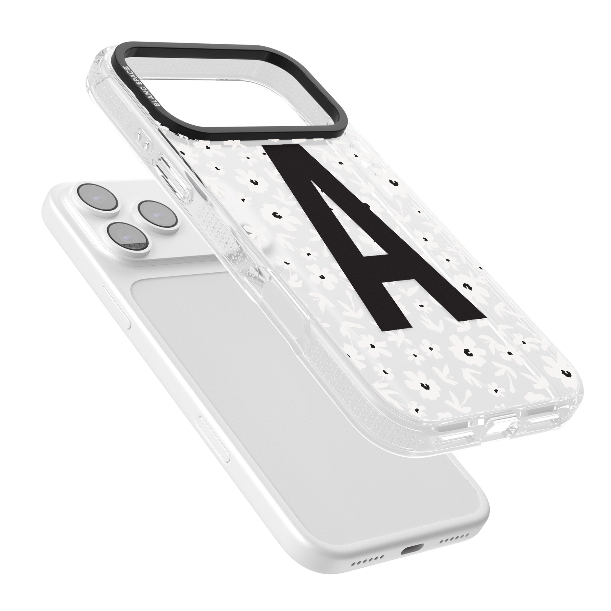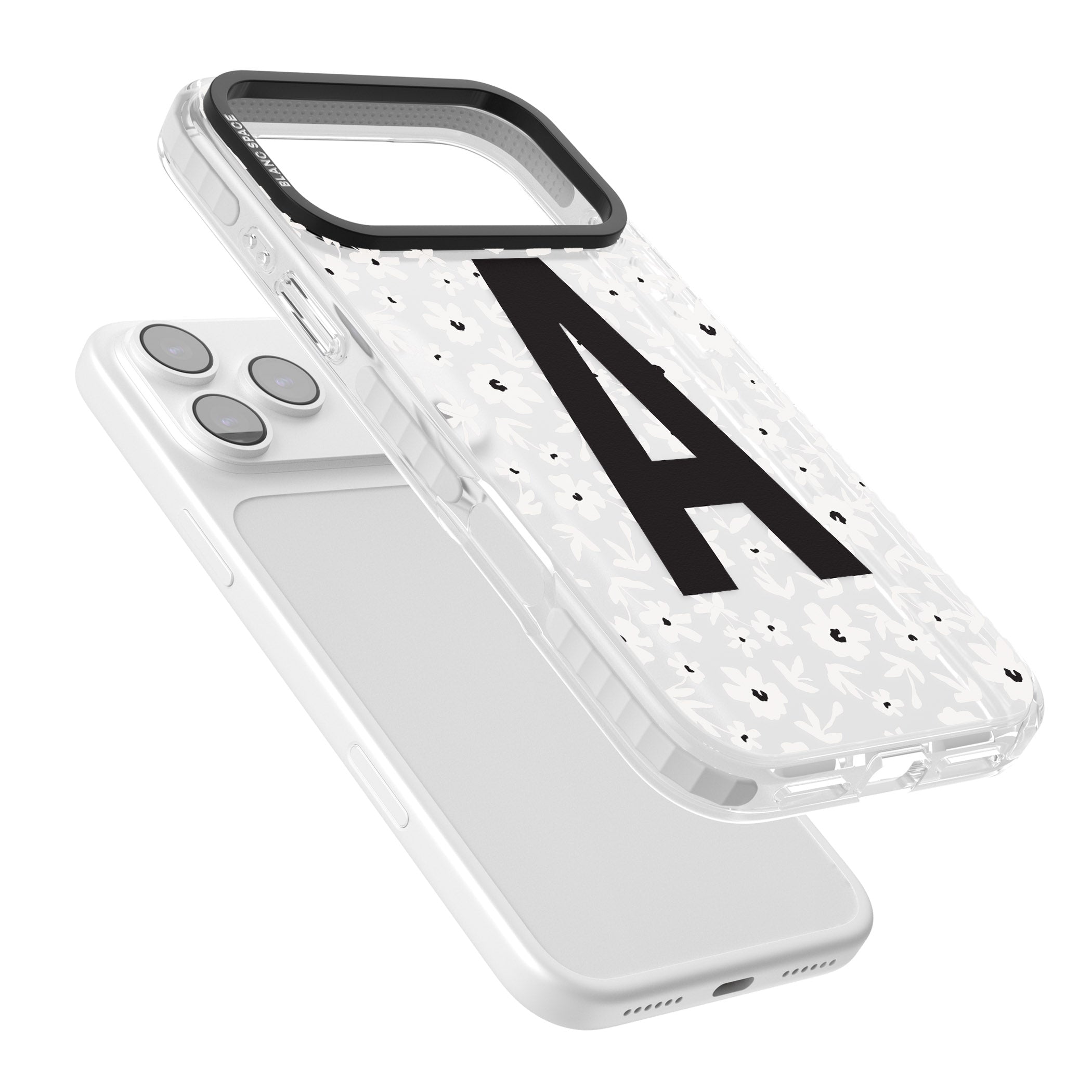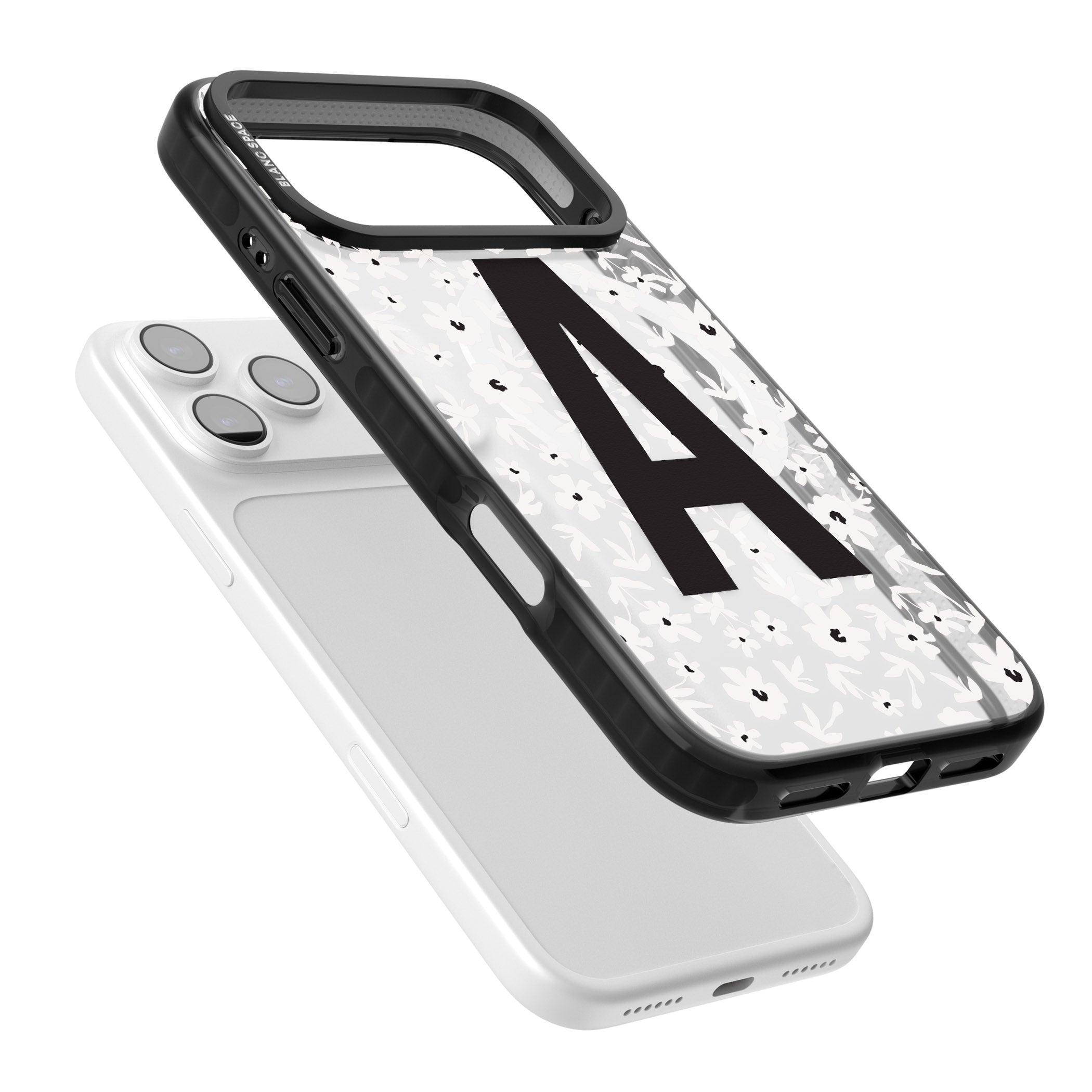 Make your mark with this bold-meets-botanical design. A standout initial sits front and center against a cascade of delicate white florals on black — the perfect blend of personality and protection.
