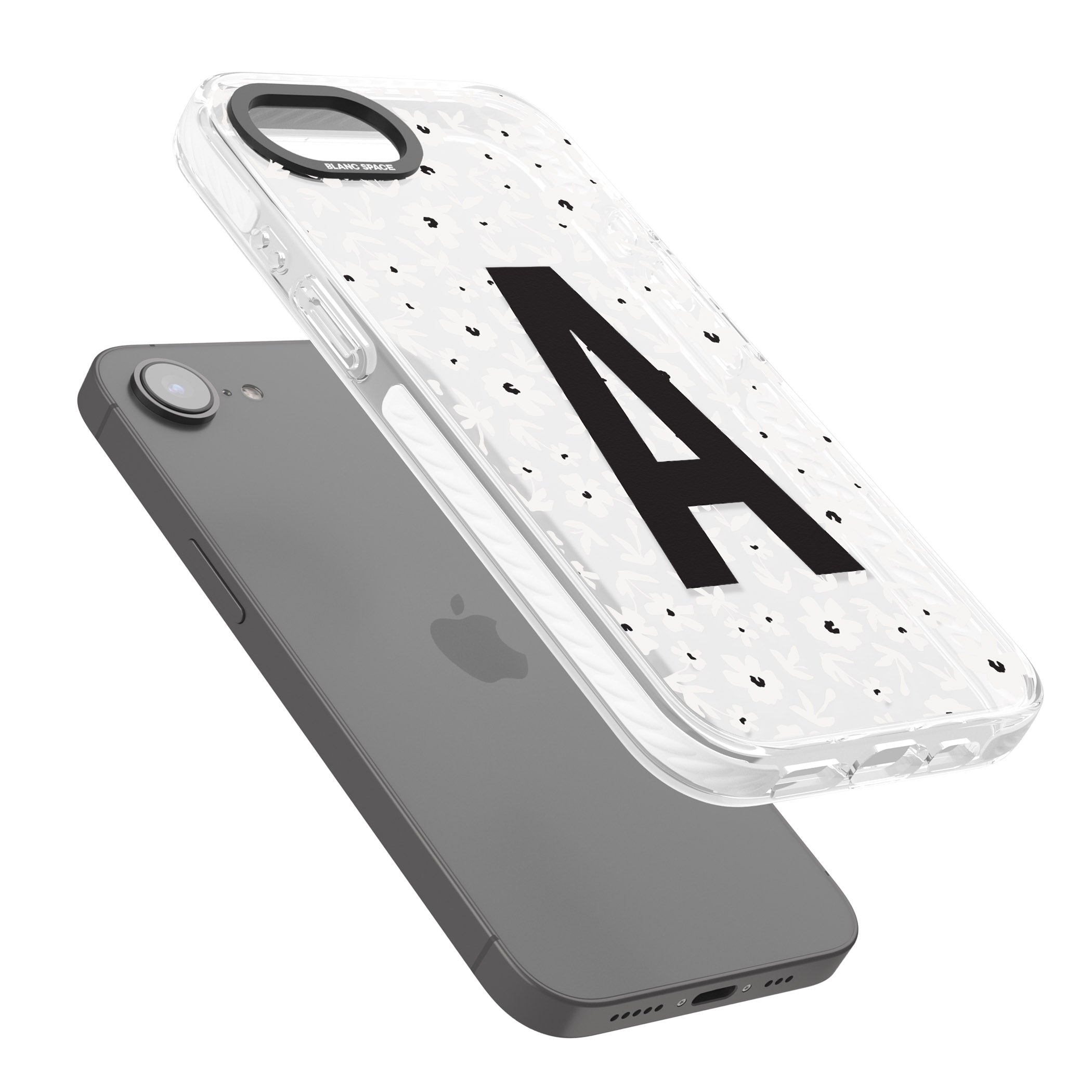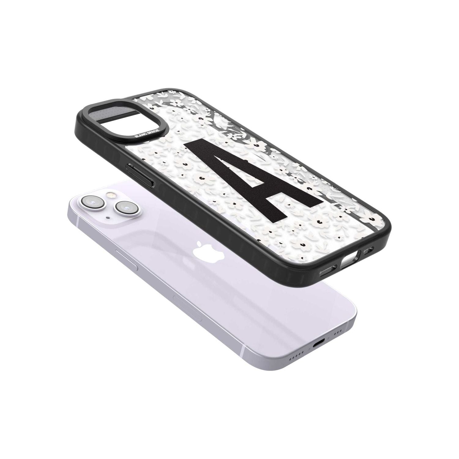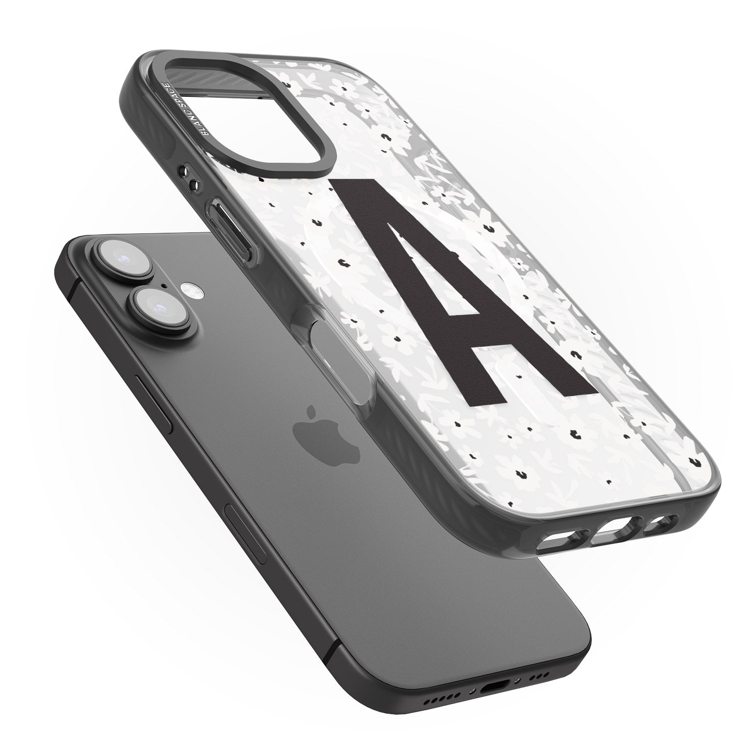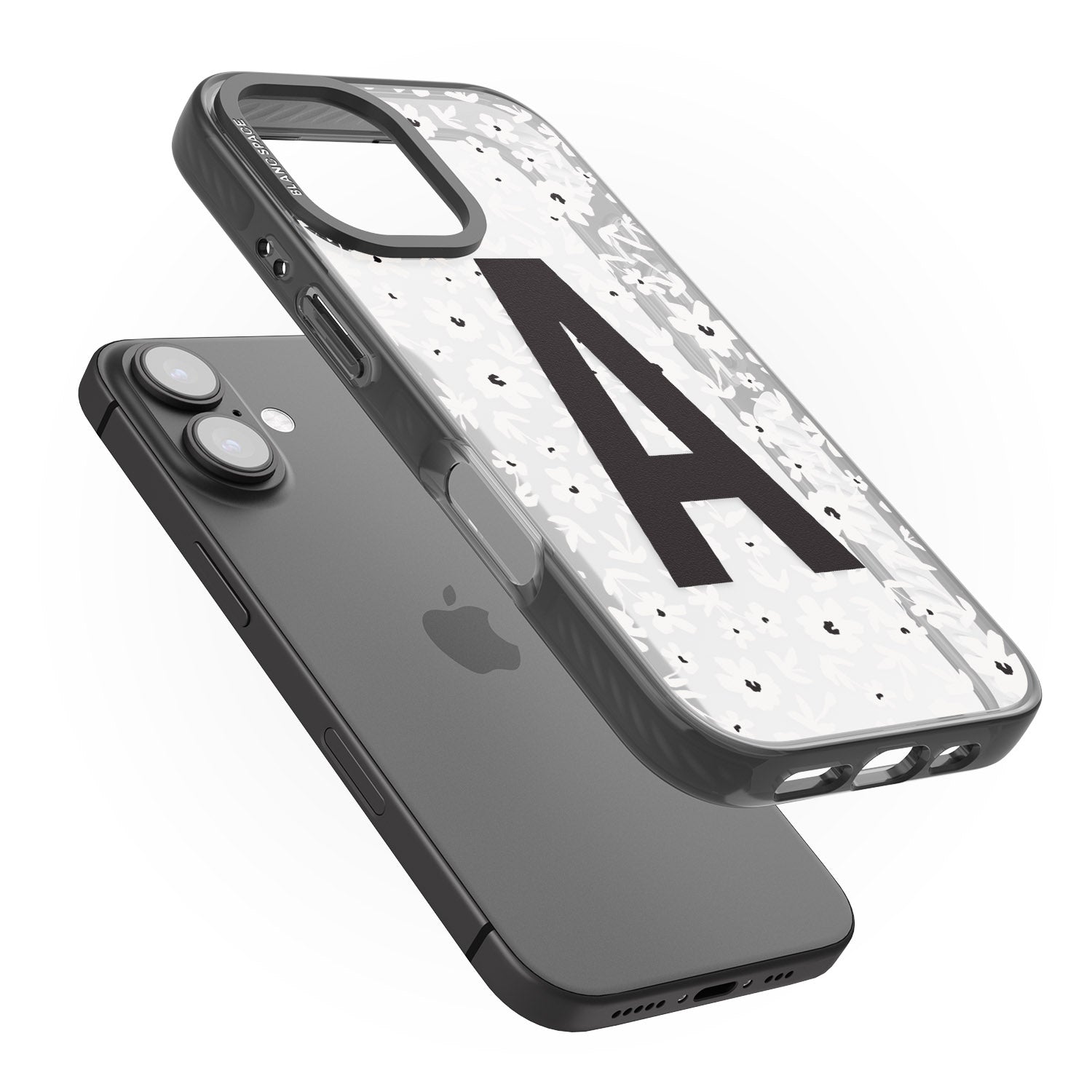 Make your mark with this bold-meets-botanical design. A standout initial sits front and center against a cascade of delicate white florals on black — the perfect blend of personality and protection.