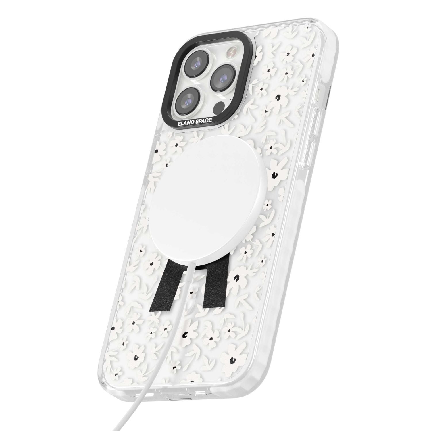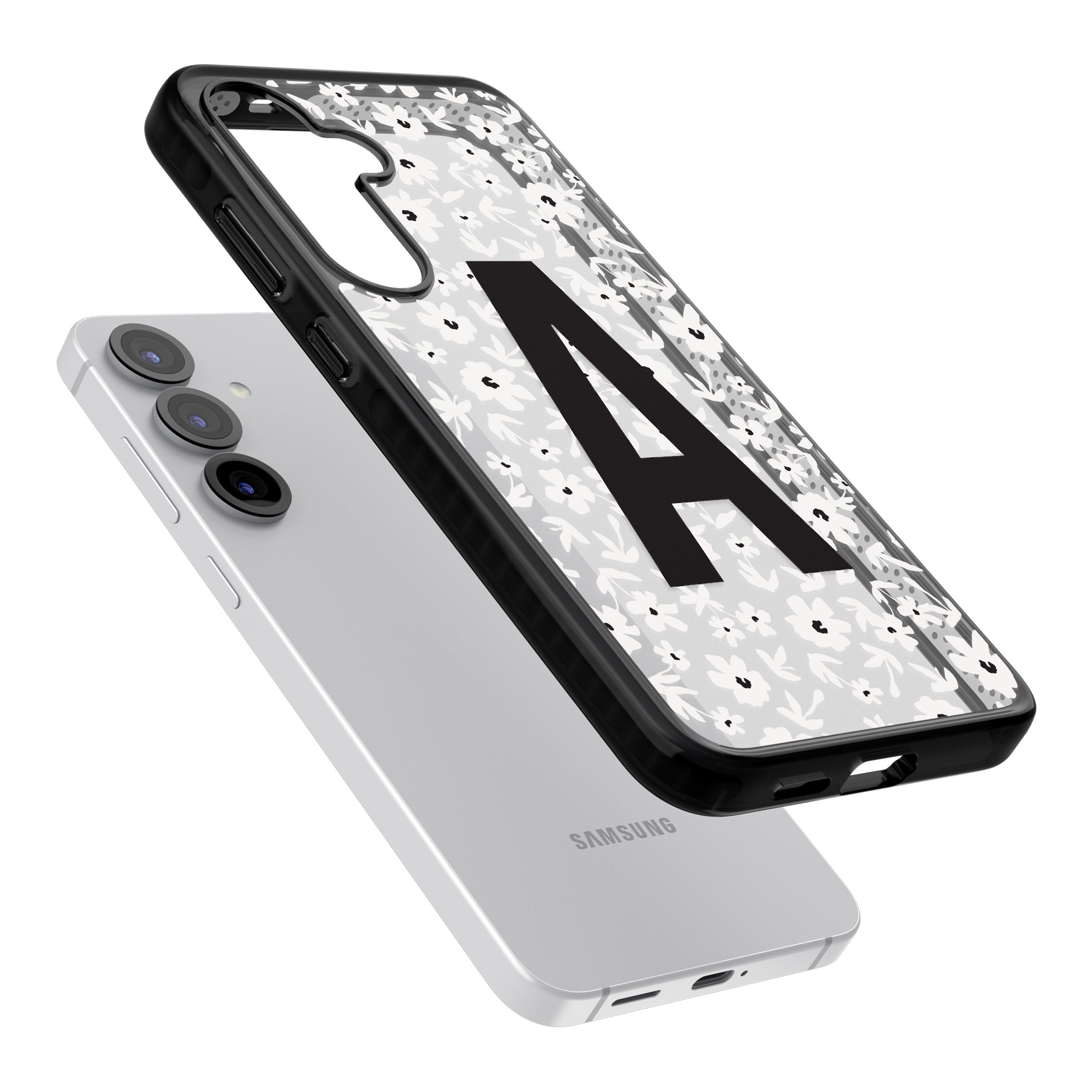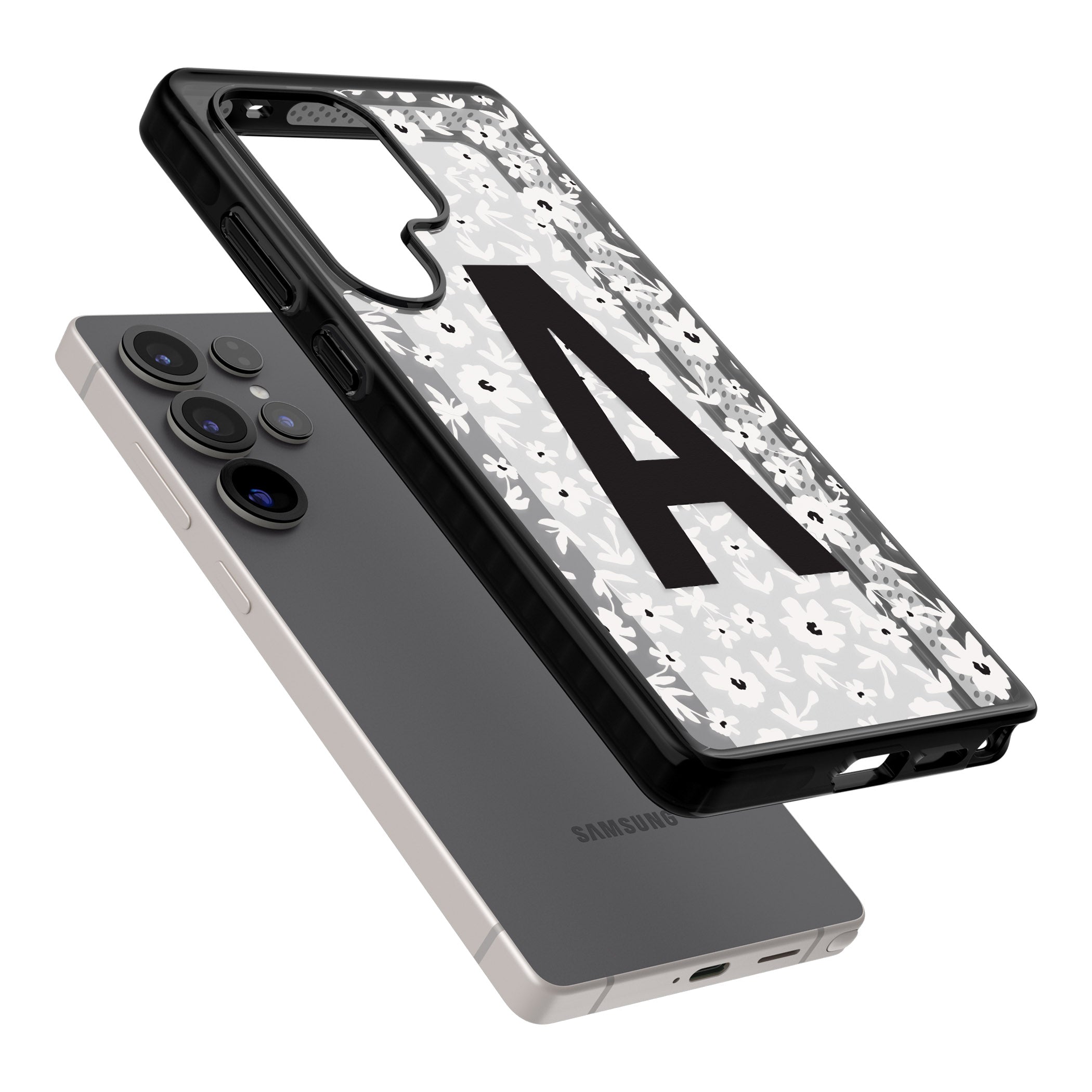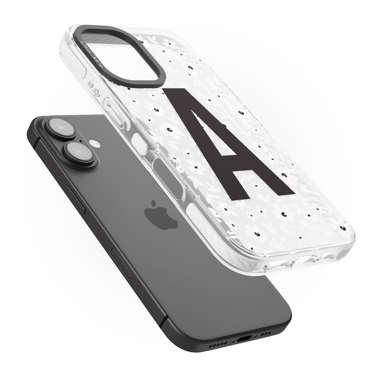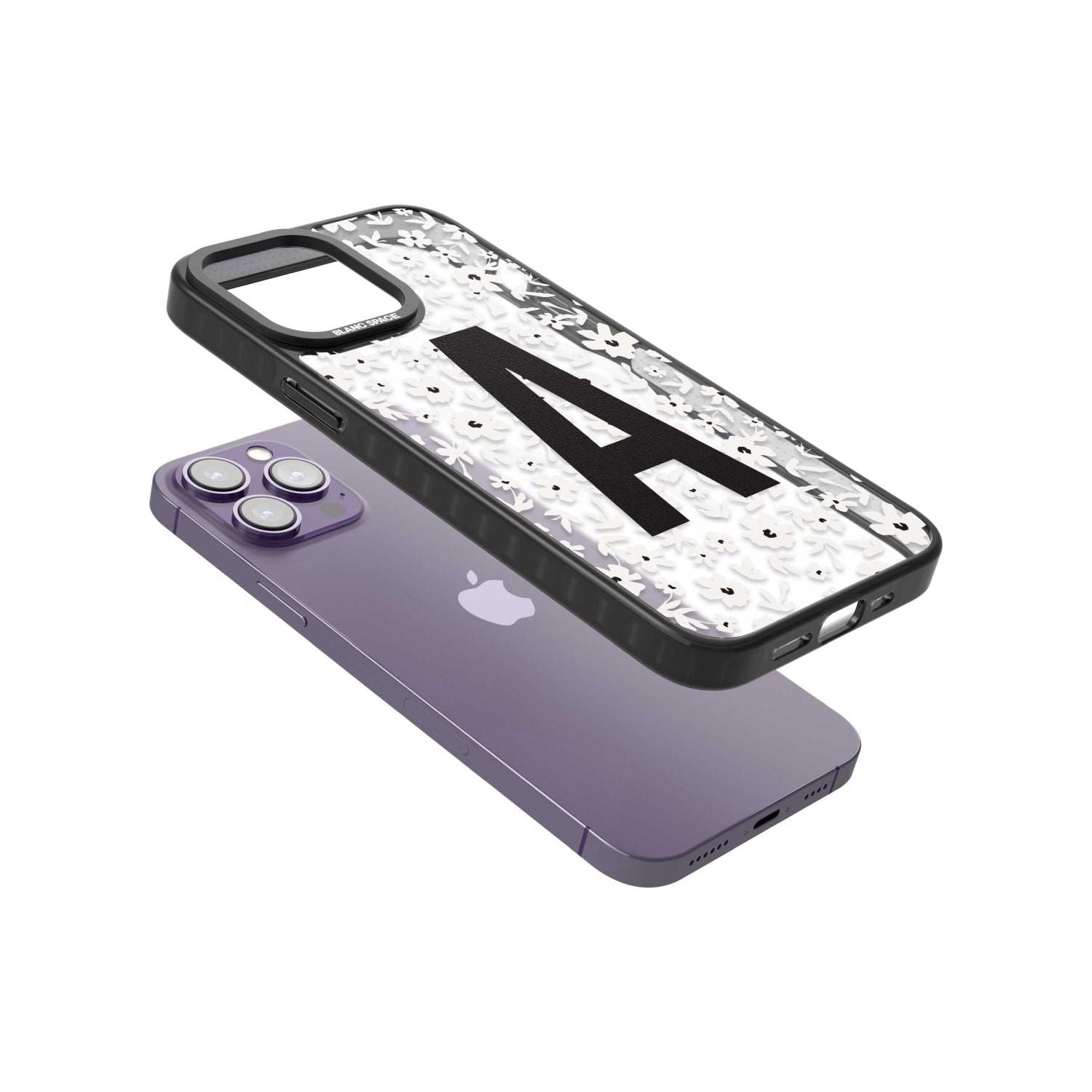 Make your mark with this bold-meets-botanical design. A standout initial sits front and center against a cascade of delicate white florals on black — the perfect blend of personality and protection.
